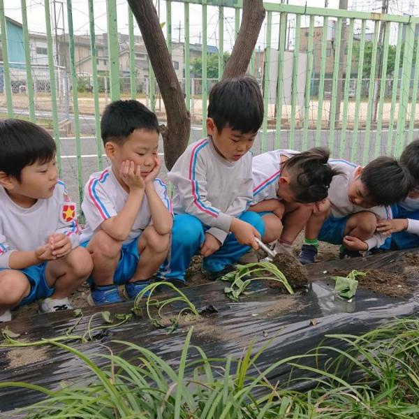 今日、年長児が保育園の畑に芋の苗を植えました。