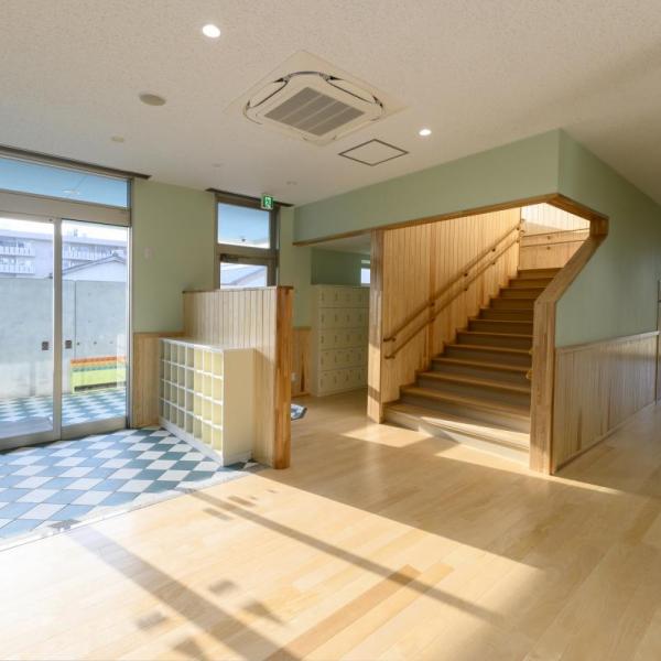 玄関を入ると柔らかなグリーンを基調とした内装で、大きな窓が太陽の光をたくさん取り込み、穏やかな気持ちで園生活が過ごせるよう配慮されております。